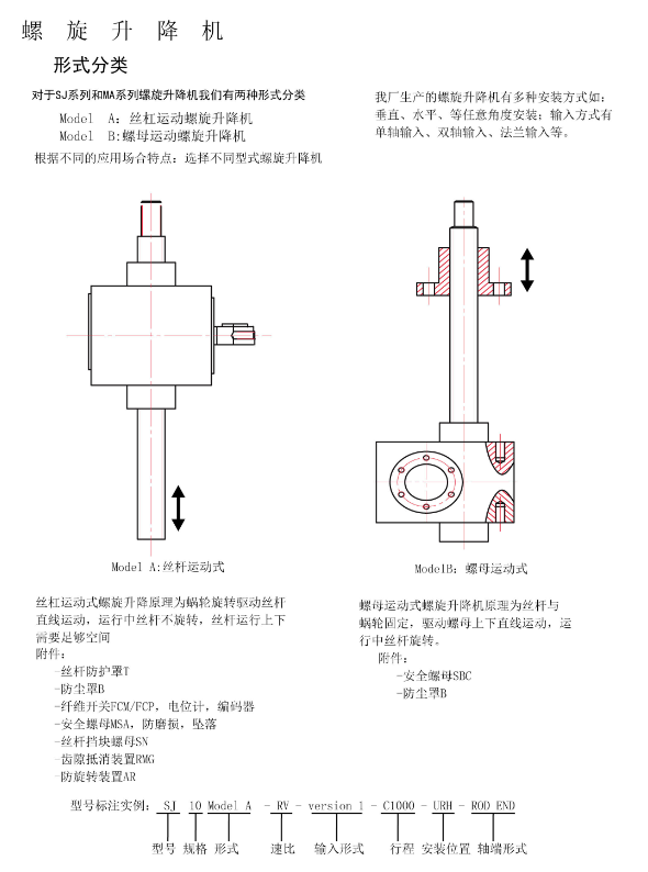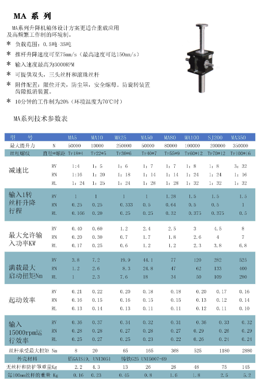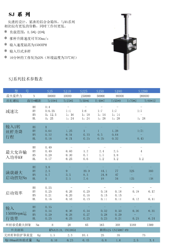 SJ\MA系列涡轮丝杠升降机是由蜗轮蜗杆、箱体、轴承、丝杠等零部件组成。工作原理为:电机或者手动驱动蜗杆旋转,蜗杆驱动蜗轮减速旋转,蜗轮内腔加工为内螺纹,驱动丝杠上下移动,由于内部有蜗轮蜗杆,丝杠的减速作用,达到放大推力的作用。最重要特点是:自锁性能、同步性、精度定位、速度控制、推力控制。广泛应用于升降舞台,同步升降台,钢铁/造纸/军工等行业。