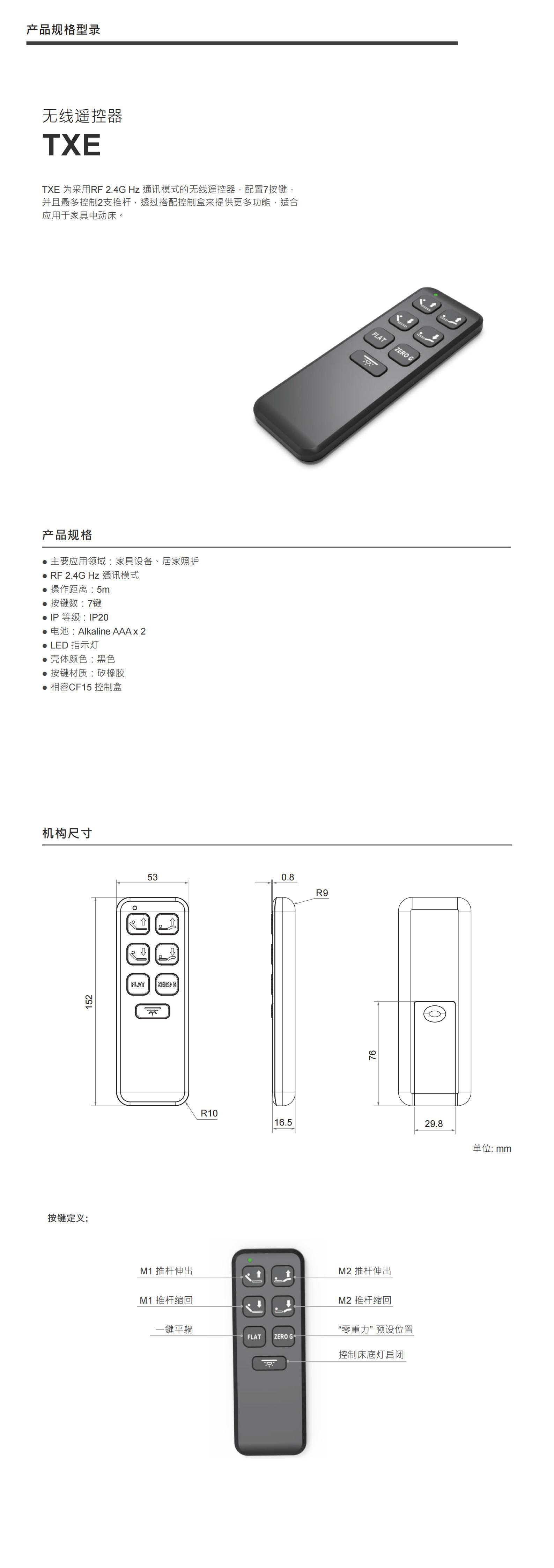 TXE为采用RF 2.4G Hz 通讯模式的无线遥控器,配置7按键,并且最多控制2支推杆,透过搭配控制盒来提供更多功能,适合应用于家具电动床。