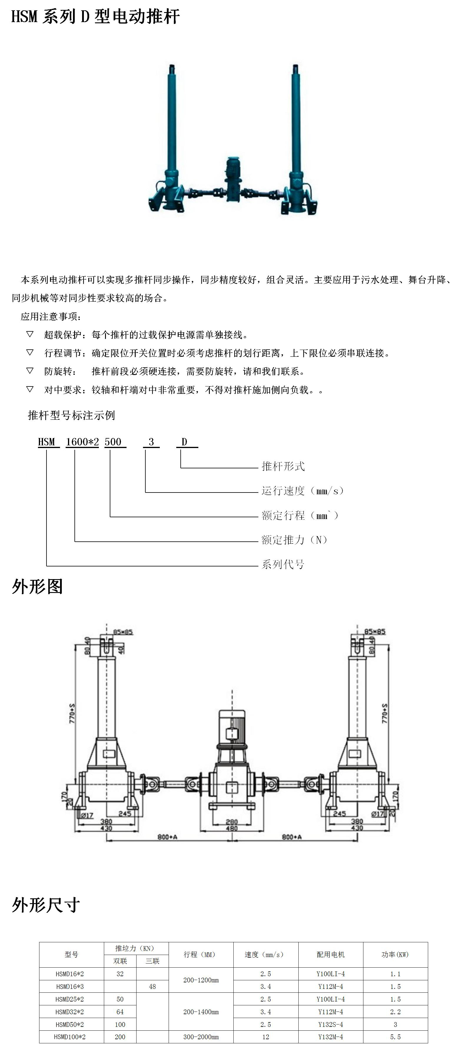 HSMJ-D型交流电动推杆可以实现多推杆同步操作,同步精度较好,组合灵活。主要应用于污水处理、舞台升降、同步机械等对同步性要求较高的场合。