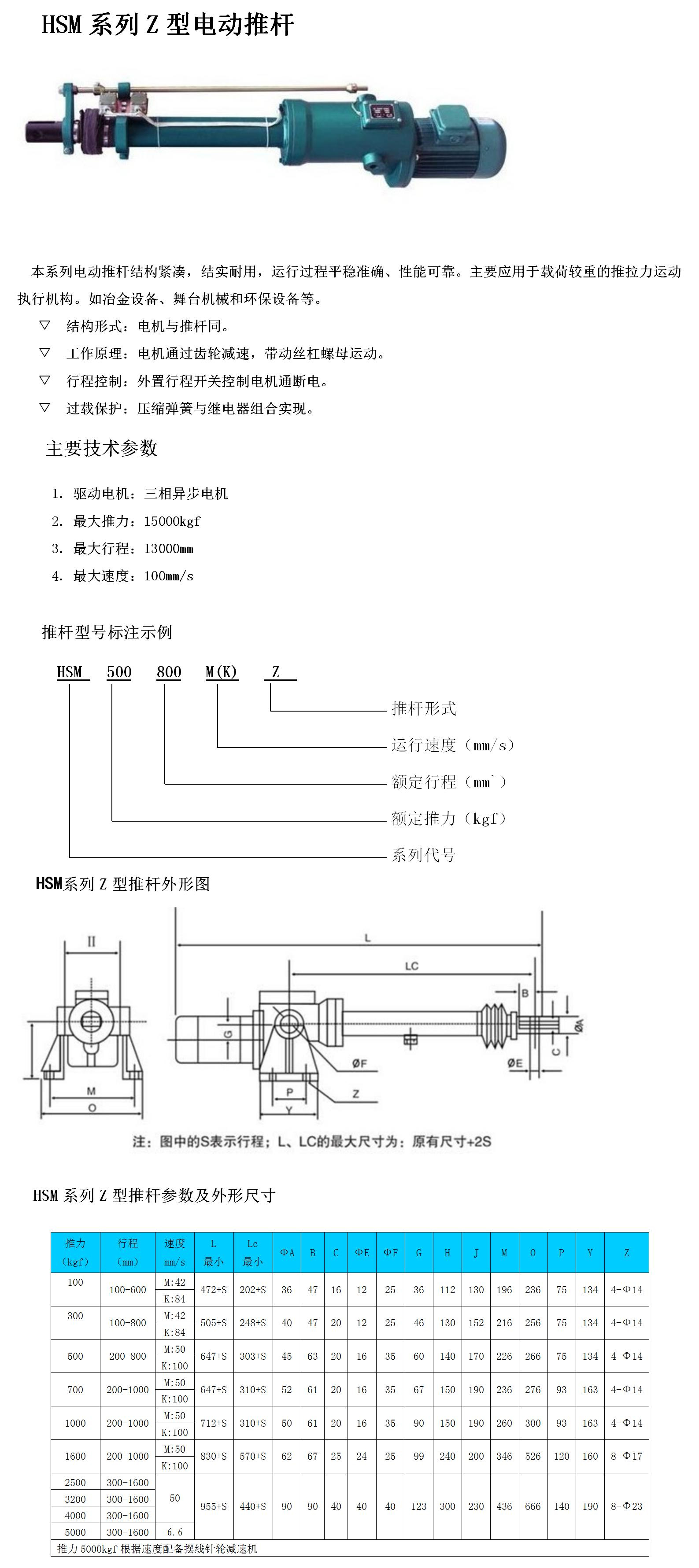 HSMJ-Z型交流电动推杆结构紧凑,结实耐用,运行过程平稳准确、性能可靠。主要应用于载荷较重的推拉力运动执行机构。如冶金设备、舞台机械和环保设备等。